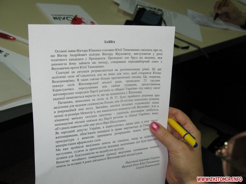 Вопросом, вынесенным на сессию под номером 37, было принятие решения о выделении для ведения садоводства более 20 элитных земельных участков в рекреационной зоне города. Очевидно, что аппетиты местных «садоводов» несколько меньше, чем размеры «Межгорья», которое пытается оставить себе Янукович. Но в конце концов ситуация идентична – украинцев, житомирян грабят ненасытные местные князьки от Партии регионов и «Нашей Украины», которых объединила вокруг себя мэр города Вера Шелудченко.