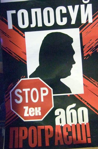 На ней был написан слоган "Голосуй или проиграешь! "и автомобильный знак "Стоп» дополненный словом «ZEK» на фоне мужского силуэта, напоминающего В. Януковича.