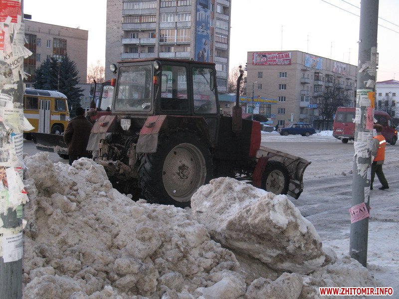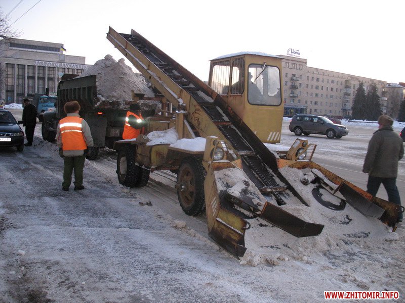 22 января в центе Житомира появилась техника. На площади Соборной началась тотальная уборка снега. Снегоочистители и грузовики работали с обеда и вечера. На пешеходной улице Михайловской, прямо под окнами Житомирской мэрии сотрудники магазинов и фирм тоже вышли на борьбу со снегом. Лопатами и ломами разбивали слежавшиеся сугробы, но разбрасывали снег прямо под ноги многочисленным прохожим.