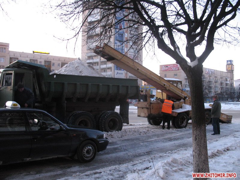 22 января в центе Житомира появилась техника. На площади Соборной началась тотальная уборка снега. Снегоочистители и грузовики работали с обеда и вечера. На пешеходной улице Михайловской, прямо под окнами Житомирской мэрии сотрудники магазинов и фирм тоже вышли на борьбу со снегом. Лопатами и ломами разбивали слежавшиеся сугробы, но разбрасывали снег прямо под ноги многочисленным прохожим.