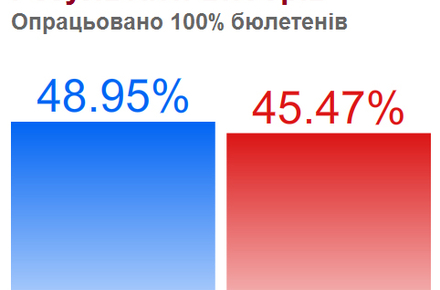 48,95% избирателей проголосовали за кандидата в Президенты, лидера Партии регионов Виктора Януковича, 45,47% – за кандидата в Президенты, премьер-министра Юлию Тимошенко, по результатам подсчета 100% протоколов участковых избирательных комиссий.