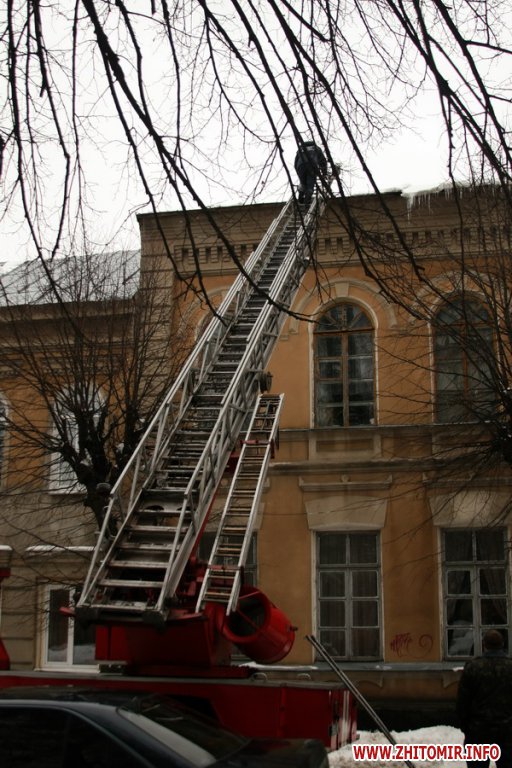 15 февраля МЧСники сбивали снег с крыши дома творчества (бывший дворец пионеров), что на площади Королева в центре Житомира.