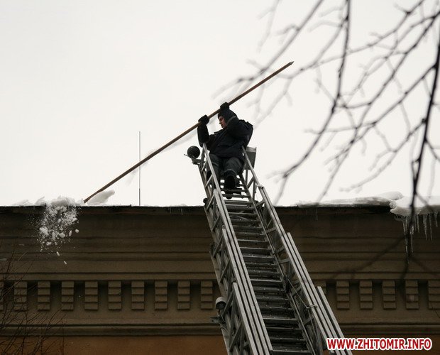 «МЧСники сегодня прибирали снег с крыши здания Творчества, это бывший «Дворец пионеров». Сотрудники службы спасения выбрали именно это здания, поскольку к ним обратились работники дома творчества, так как проход под ним наиболее опасен», - сообщает Сергей Уланов сотрудник пресс-службы главного управления МЧС Украины в Житомирской области.