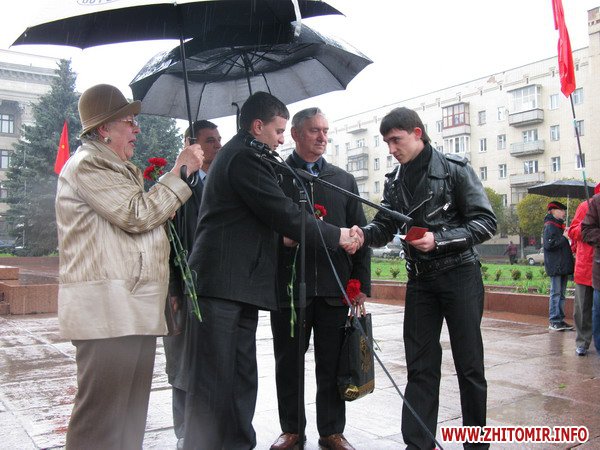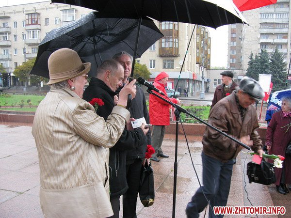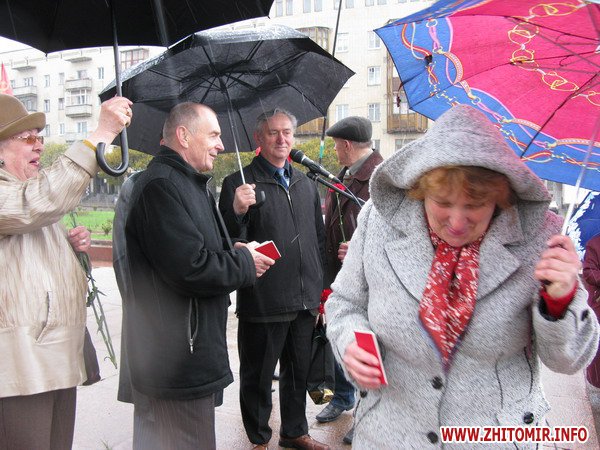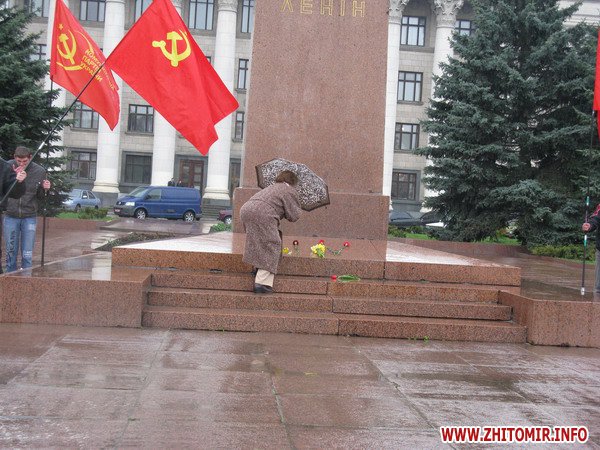 В Житомире 22 апреля возле памятника Ленину на Соборном Майдане областная организация Коммунистической партии Украины принимала новых членов в партию и комсомол. Проведению этого мероприятия не помешал даже дождь с градом, который начал идти через несколько минут после начала коммунистического митинга. Как всегда, представители Житомирской областной организации КПУ проявили пунктуальность и дисциплину. Мероприятие возле памятника Ленину в Житомире началось ровно в назначенное время, 10 часов утра. Большинство участников митинга, люди пенсионного возраста, пришли сюда с букетами цветов. Митинг был посвящен 140-летию со дня рождения Ленина и проходил под девизом «Ленин живее всех живых».