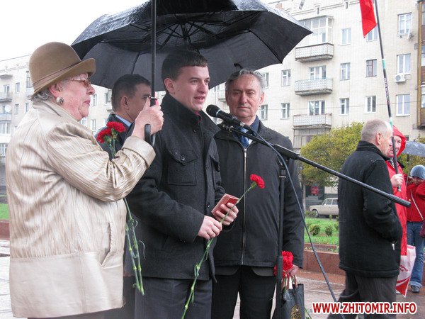 В Житомире 22 апреля возле памятника Ленину на Соборном Майдане областная организация Коммунистической партии Украины принимала новых членов в партию и комсомол. Проведению этого мероприятия не помешал даже дождь с градом, который начал идти через несколько минут после начала коммунистического митинга. Как всегда, представители Житомирской областной организации КПУ проявили пунктуальность и дисциплину. Мероприятие возле памятника Ленину в Житомире началось ровно в назначенное время, 10 часов утра. Большинство участников митинга, люди пенсионного возраста, пришли сюда с букетами цветов. Митинг был посвящен 140-летию со дня рождения Ленина и проходил под девизом «Ленин живее всех живых».