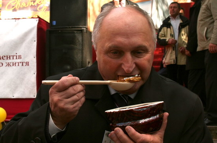 Мэр Коростеня Владимир Москаленко дигустирует деруны во время первого фестиваля в 2008 году.