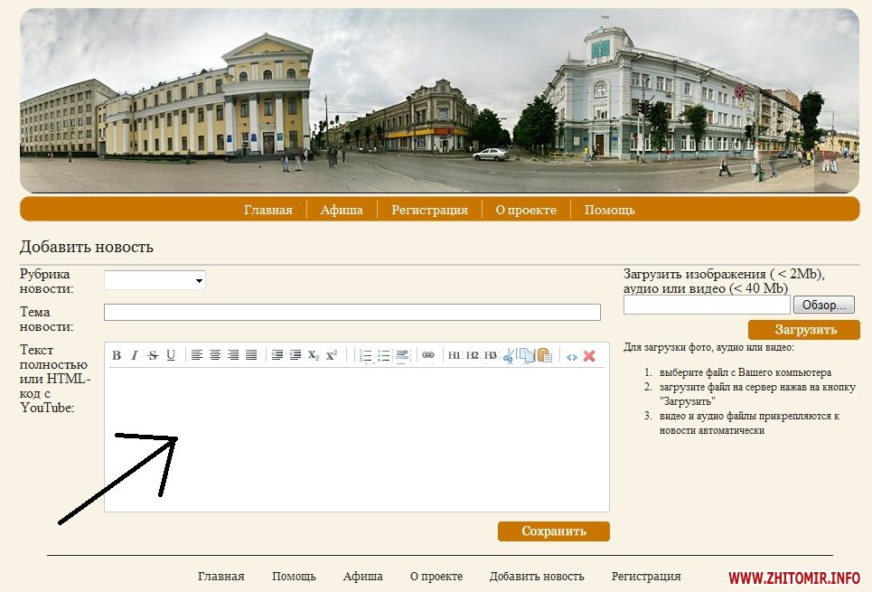 3. Выбираем раздел новости, пишем заглавие и вставляем текст и/или код с YouTube/Vimeo. В правой части экрана добавляем фото или видео.
