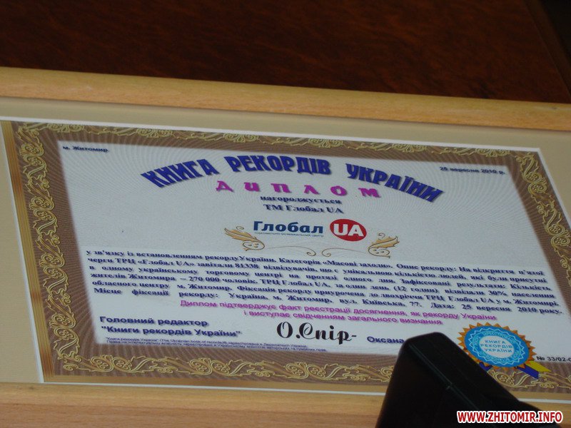 Также Николай Бирюченко сообщил, что ТРЦ "Глобал UA" в Житомире попал в Книгу рекордов Украины в категории «массовые мероприятия»: двухлетний юбилей ТРЦ Глобал 26 сентября 2010 года за день смогли посетить более 81300 житомирян и гостей города.