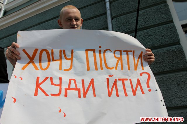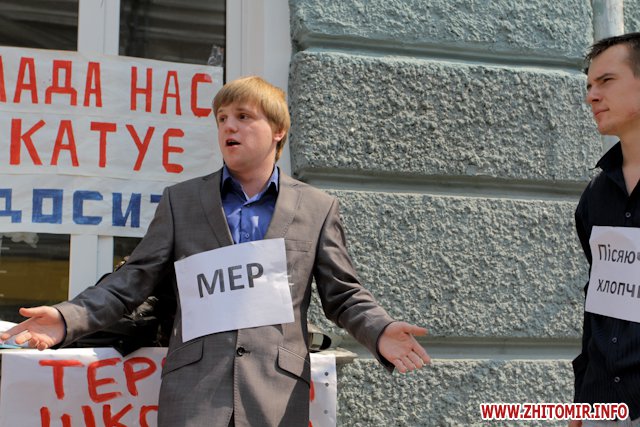 Активісти «Академії практичної адвокації» та «Демократичного альянсу» показали театралізовану сценку, як мешканці Житомира шукають туалет. Не знайшовши його, один з них справляє потребу в горщик, а інший - в підгузник.