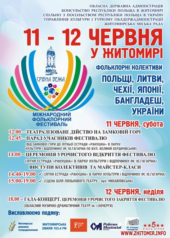 11 - 12 червня місто Житомир у рамках міжнародного фольклорного фестивалю «Срібна Вежа» збирає колективи з різних країн світу: Польщі, Литви, Чехії, Японії, Бангладеш, України.