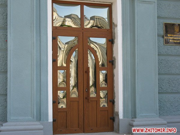 Вход в мэрию Житомира теперь украшает и новая, недавно установленная "зеркальная" дверь.