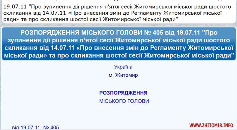 В связи с этим, мэр остановил действие решения пятой сессии Житомирского городского совета шестого созыва от 14.07.11 «О внесении изменений в Регламент Житомирского городского совета».