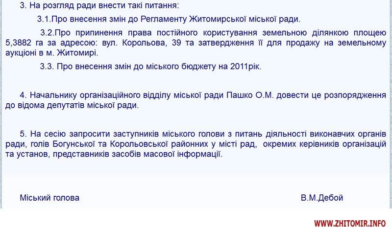 Мэр Житомира Владимир Дебой своим распоряжением от 19 июля остановил действие решения пятой сессии Житомирского городского совета шестого созыва от 14.07.11 «О внесении изменений в Регламент Житомирского городского совета » и о созыве шестой сессии Житомирского городского совета".