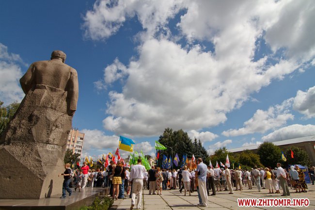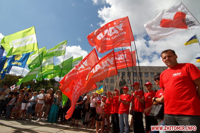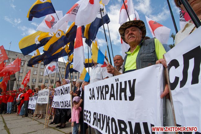 У центрі Житомира на площі імені Сергія Корольова пройшов мітинг опозиційних сил, у якому взяли участь прихильники політичних сил: "Батьківщини", «Фронту змін», "ВО "Свобода", "Народного руху України", «Реформи та порядок», «Української платформи», «Удар», УРП «Собор», "За Україну".