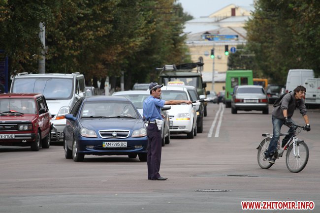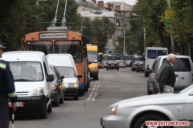 8 сентября в центре Житомира пробки тянущиеся и ряды автомобилей, движение регулируют сотрудники ГАИ. Город готовится к празднованию 1127 годовщины основания города, поэтому центральная площадь Соборная перекрыта.