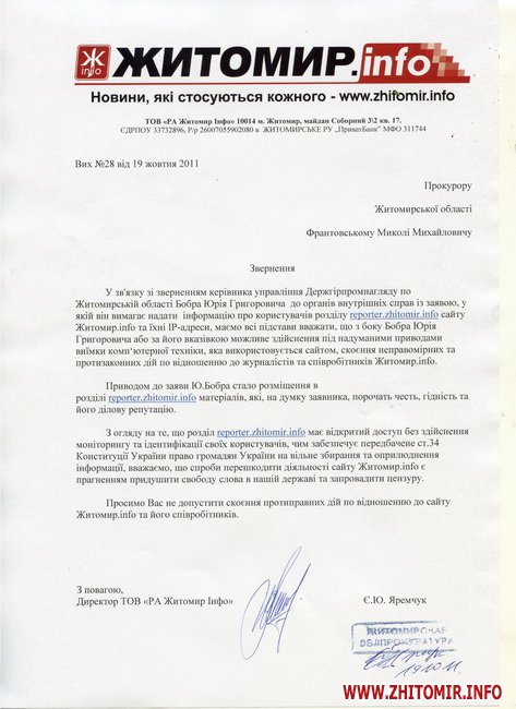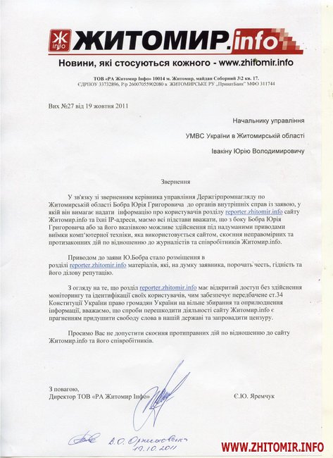 «В связи с обращением руководителя управления Госгорпромнадзора по Житомирской области Бобра Юрия Григорьевича в органы внутренних дел с заявлением, в котором он требует предоставить информацию о пользователях раздела reporter.zhitomir.info сайта Житомир.info , есть все основания полагать, что со стороны Бобра Юрия Григорьевича или по его указанию возможно осуществление выемки компьютерной техники, используемой сайтом, совершение неправомерных и противозаконных действий в отношении журналистов и сотрудников Житомир.info», - сообщается в письме, направленном начальнику УМВС Украины в Житомирской области, прокурору Житомирской области и начальнику УСБУ в Житомирской области.