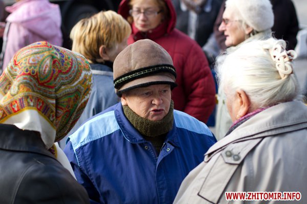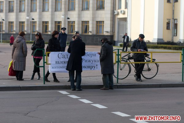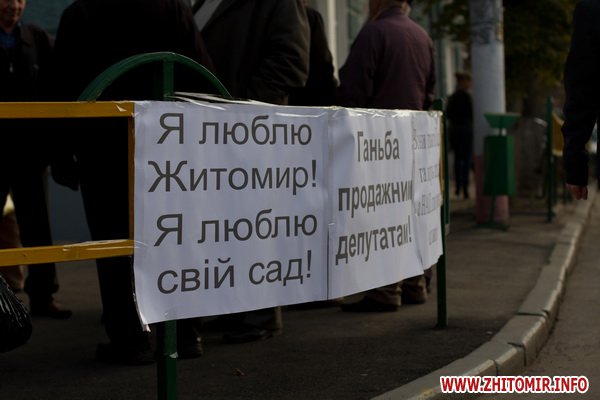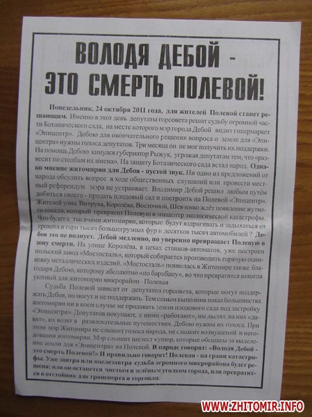 «Непонимающие» люди стояли 24 октября под стенами Житомирской мэрии с требованием не уничтожать сад и не стоить гипермаркет «Эпицентр» на Полевой. Прохожим раздавали листовки «Володя Дебой – это смерть Полевой!».