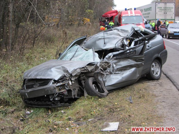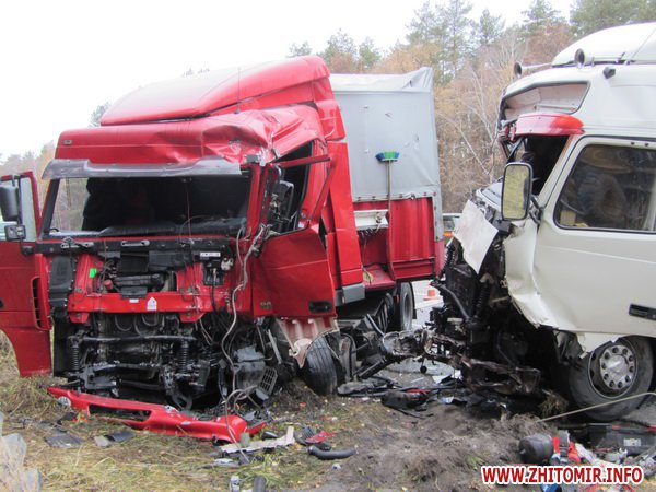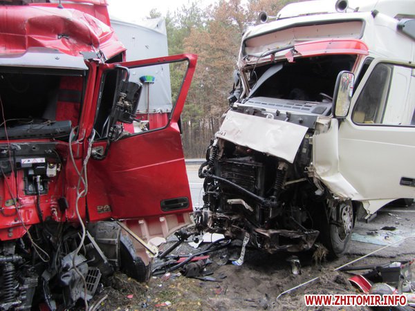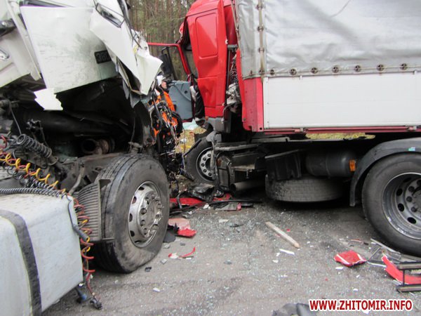 По неизвестным пока причинам грузовой автомобиль ВОЛЬВО, который ехал в направлении Житомира, выехал на полосу встречного движения, где столкнулся с легковым автомобилем ЛАДА и грузовиком ДАФ.