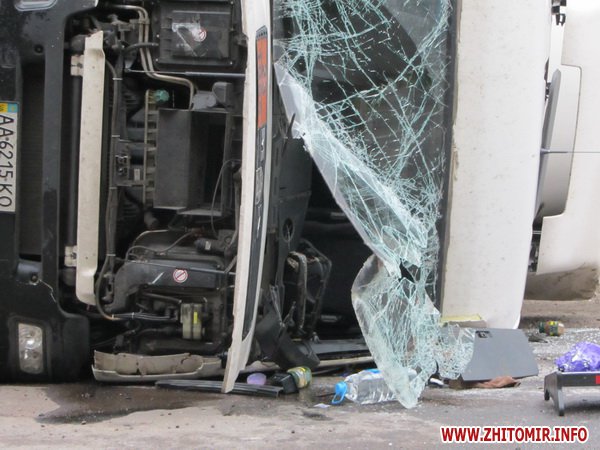 В нескольких метрах от места аварии лежит перевернутый газовоз МАН. По информации сотрудников УГАИ в Житомирской области, водитель газовоза пытался уйти от столкновения с машинами, которые попали в ДТП. Из-за больших габаритов машины он не справился с управлением и газовоз перевернулся. По словам сотрудников ГАИ, водитель МАНа серйозных повреждений не получил, но доставлен в больницу.