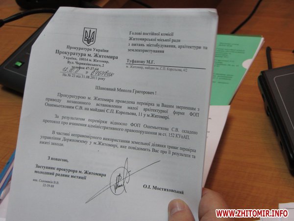 Более того, по поручению земельной комиссии ее председатель Николай Туфанов несколько раз обращался в городскую прокуратуру относительно законности строительства павильона возле «Жовтня». Туфанов зачитал ответ прокуратуры Житомира на последнее обращение (от 31.08.2011) по поводу незаконного строительства малой архитектурной формы на площади Королева, 11.