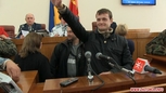 Активісти виштовхали директора Бердичівського медколеджу Володимира Клименюка з-за трибуни після того, як він хотів виступити на сесії Житомирської обласної ради 19 травня.