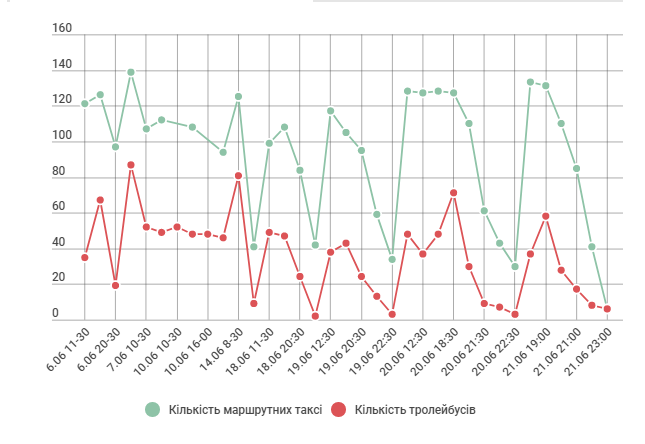 На графіку нижче показано кількість громадського транспорту на маршрутах у різні дні та години. Видно, як стрімко зменшується кількість транспорту у Житомирі після 20:00.