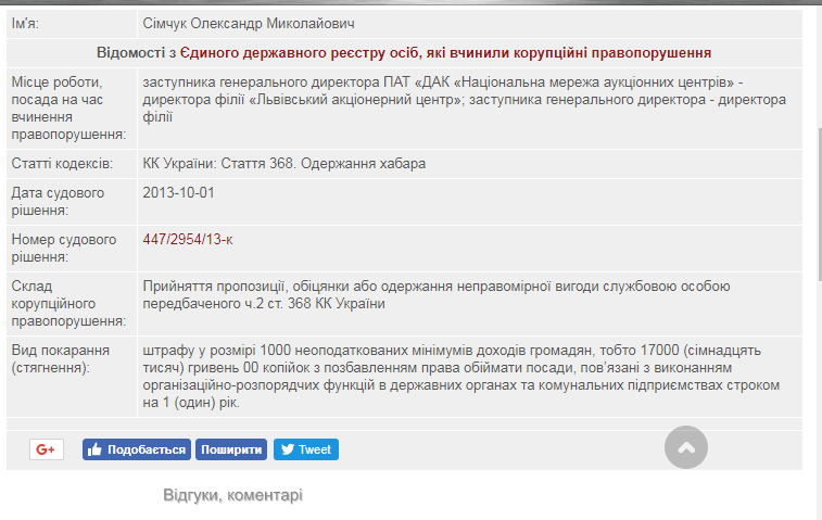 Керівником та власником ПП «Фірма «СОМГІЗ» є Сімчук Олександр Миколайович, який був засуджений за статтею 368 КК України (одержання хабара). Кошти були отримані за «безперешкодність проведення аукціону з викупу земельної ділянки за обумовленою ціною та перемогу у ньому конкретної особи, отримав за це неправомірну вигоду у розмірі 1000 доларів США».