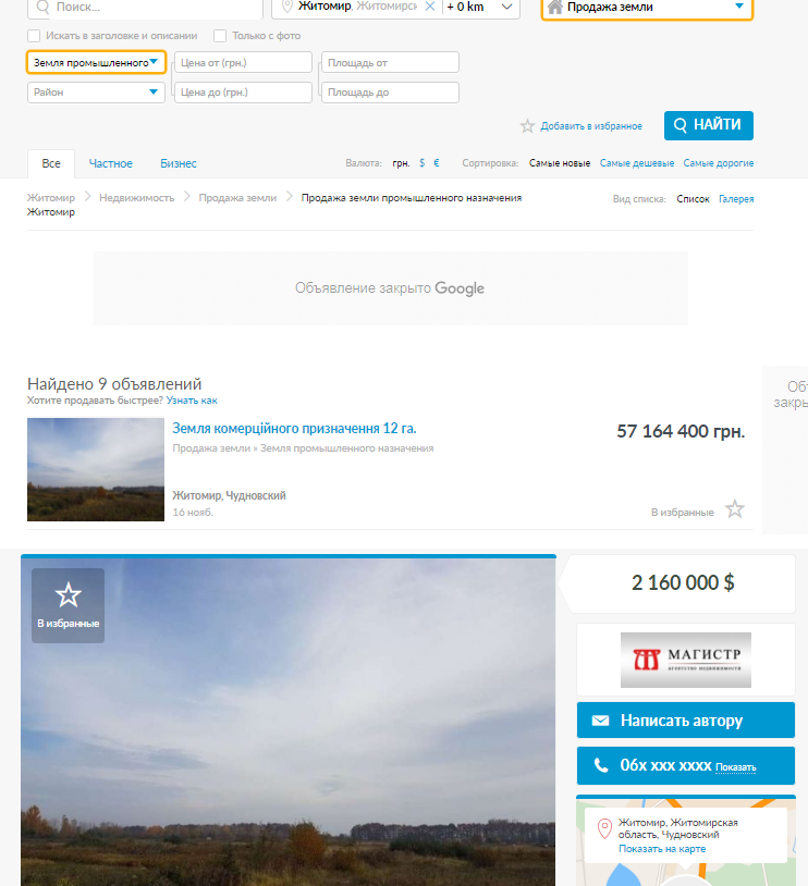 На сайті оголошень є інформація, що поблизу Житомира продається земельна ділянка комерційного призначення площею 12 га, вартість ділянки становить 57 млн грн, або 1700 доларів США за сотку.
