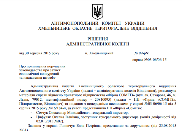 У 2015 році у Хмельницьку антимонопольним комітетом було виявлено порушення ПП «Фірма «СОМГІЗ», яка проводила аукціон щодо права оренди комунальної землі, де переможець торгів мав сплатити винагороду виконавцю торгів у розмірі 50 % від ціни продажу. Цікаво, який відсоток винагороди отримає «Фірма «СОМГІЗ» за продаж Житомирської землі?