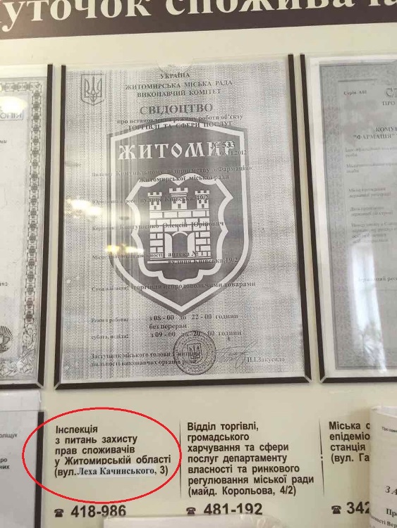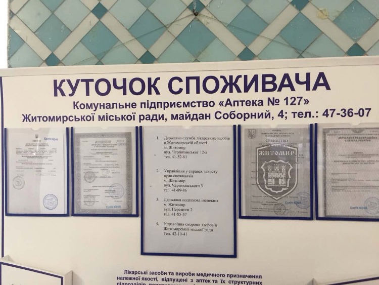 Крім того, комунальні аптеки міста вводять в оману житомирян. У вищевказаній аптеці та в КП "Аптека № 127" (Соборна площа) вказано, що Інспекція з питань захисту прав споживачів у Житомирській області знаходиться за адресою: вул. Леха Качинського (Черняховського), 3. Насправді, Інспекція вже давно переїхала звідти на Гагаріна, 55, про що повідомили в міській раді (кабінет 101). Але номера телефону Інспекції у них не виявилося.