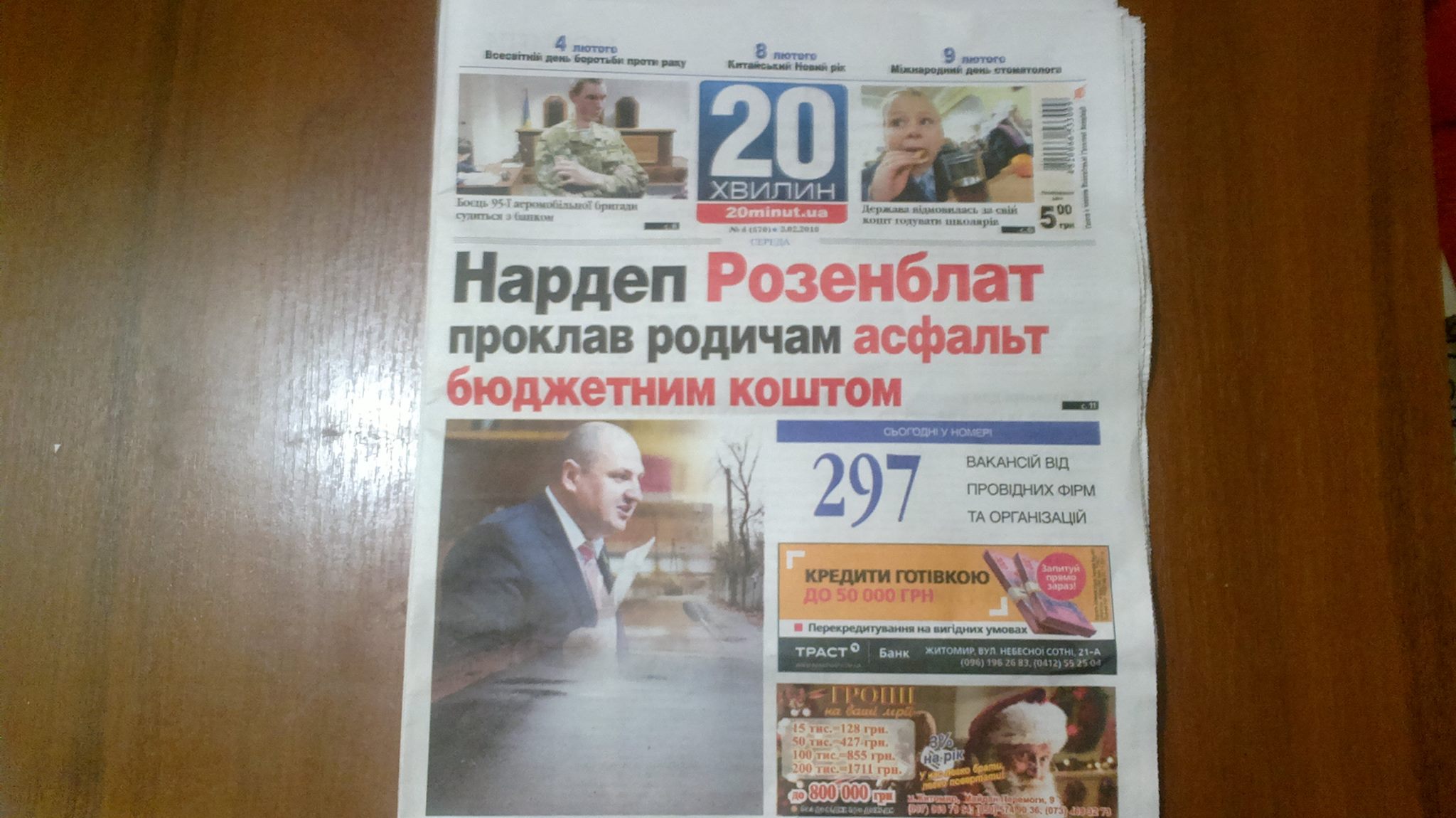 Мешканці житомирського провулку обурені статтею Романа Здорика під назвою «Нардеп Розенблат проклав родичам асфальт бюджетним коштом». Матеріал був розміщений на сайті та у газеті «20 хвилин».