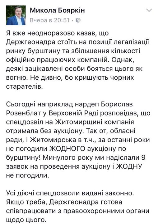 На мій виступ у Верховній Раді одразу відреагував т.в.о. Голови Держгеонадр Микола Бояркін. Він написав пост, у якому звинуватив мене у кришуванні чорних старателів. Який ступень цинізму та лицемірства цього посту!