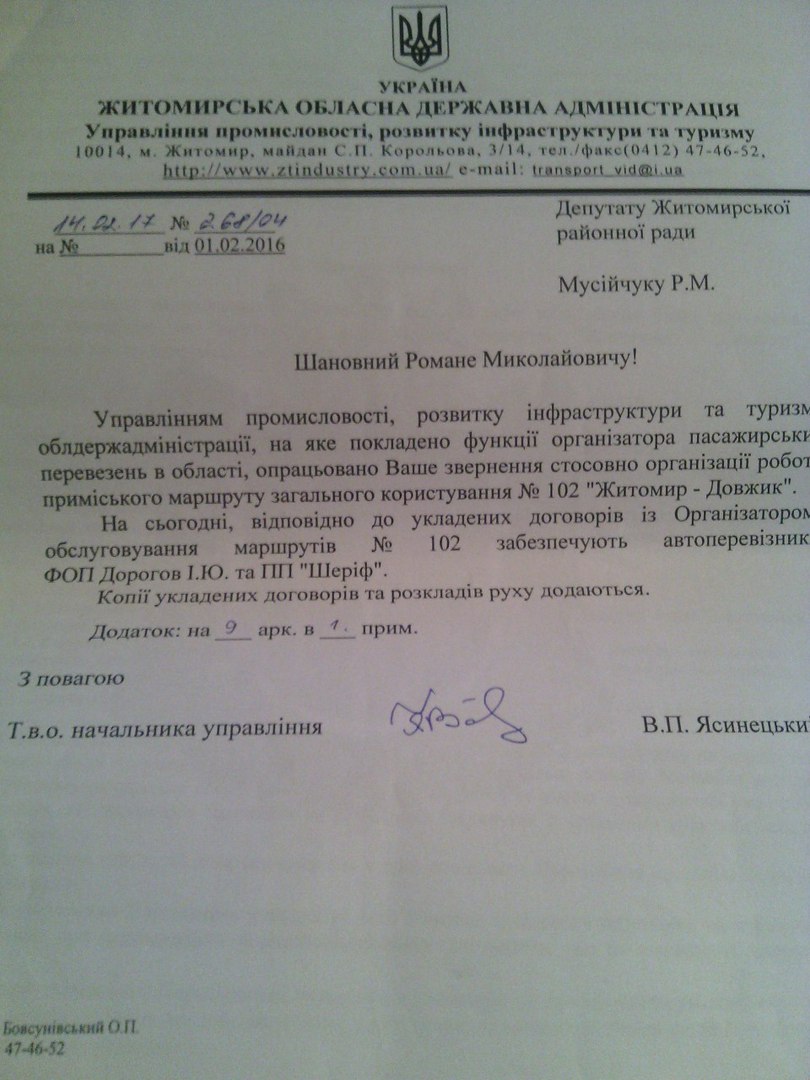 20 січня 2017 року управління транспорту Житомирської ОДА уклало тимчасову угоду з ПП "Шеріфф" на право обслуговування приміського автобусного маршруту № 102 "Житомир - Довжик" на 34 оборотних рейси з роботою в режимі "маршрутного таксі". Варто нагадати що ще один перевізник обслуговує село Довжик - це ФОП Дорогов, який має теж 34 оборотних рейси в звичайному режимі руху.