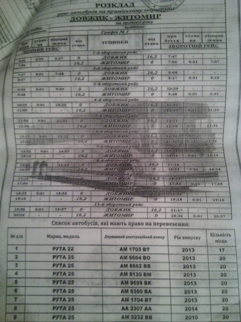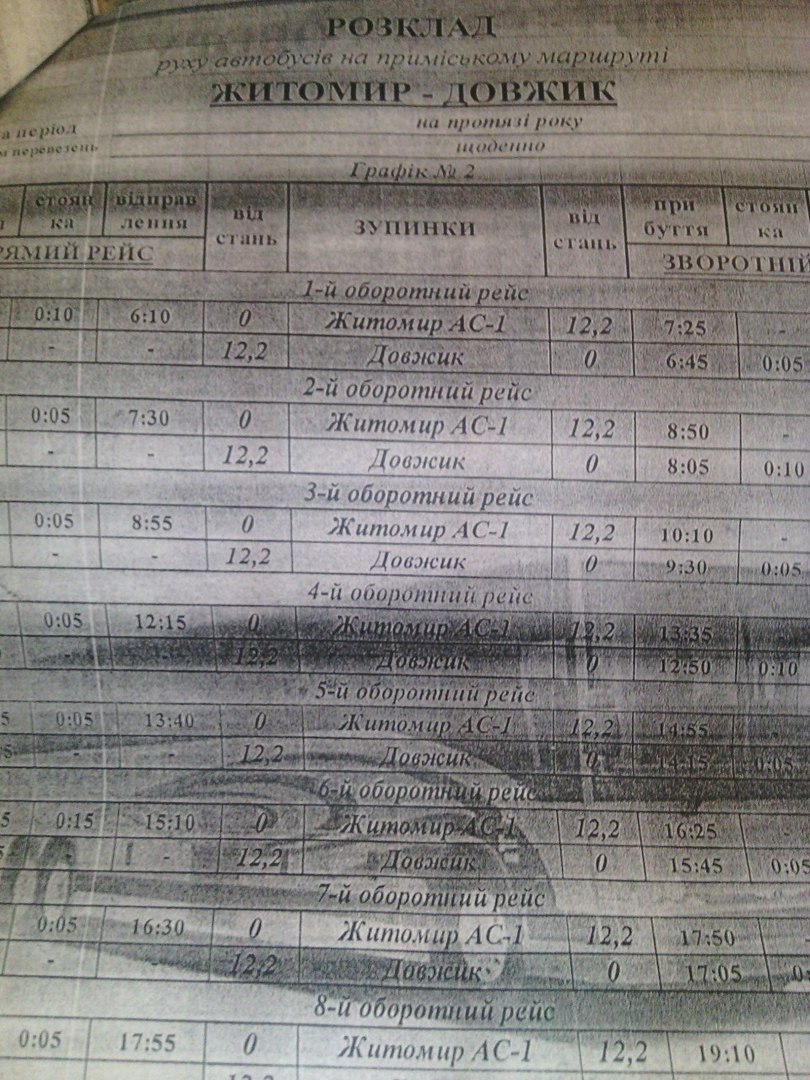 Звісно, це добре що населений пунк забезпечений здається в повному обсязі транспортним сполученням з містом. Але є ДВА цікавих нюанса. На фото з розкладом руху ( фото 2 ) розклад перевізника Дорогова в якому вказано що його автобусний маршрут № 102 відправляється з Житомирського автовокзалу ( у розкладі Житомир АС 1 ) із зазначенням протяжності маршруту до с. Довжик 12,2 км. Натомість на фото з розкладом руху ( фото 3) перевізника ПП "Шеріфф" не вказано конкретно де в місті Житомир перевізник розпочинає рух, а вказано просто ЖИТОМИР ( я так розумію перевізник звідки хоче звідти і відправляється, якщо немає конкретної привязки, ХОЧА ЛОГІЧНО ЩО ДЛЯ ПРИМІСЬКОГО МАРШРУТУ ТО ПОВИННА БУТИ АВТОСТАНЦІЯ) От така маленька хитрість з боку управління для перевізника, ноу - хау, просто вписати для одного перевізника відправлення з ЖИТОМИР АВТОВОКЗАЛ, і іншому просто ЖИТОМИР. Також у ПП Шеріфф набагато більша протяжність з Житомира до Довжика аж 16,2 км, тобто логічно що перевізник аж ніяк не їде з Автовокзалу.