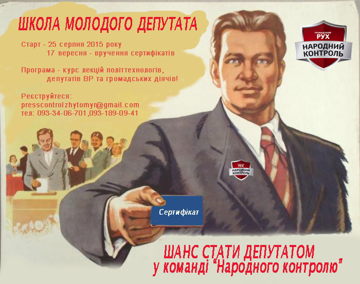 «Проект стартує 25 серпня 2015 р., завершення курсу – 17 вересня. Слухачі курсу отримають сертифікати про проходження курсу в Школі молодого депутата. Кращих слухачів курсу ми запрошуємо в команду «Народного контролю.