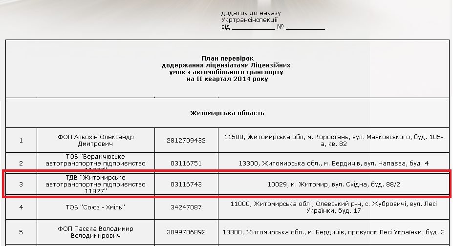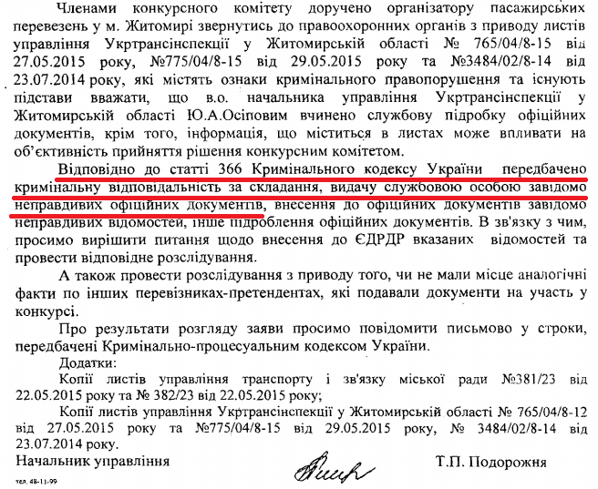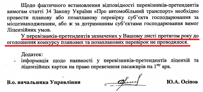 Вже після конкурсу стало відомо, що Укртрансінспекція перевіряла і Житомирське АТП 11827, що також підтверджує недостовірність інформації, наданої конкурсному комітету і факт неналежної доповіді пана Осіпова.
