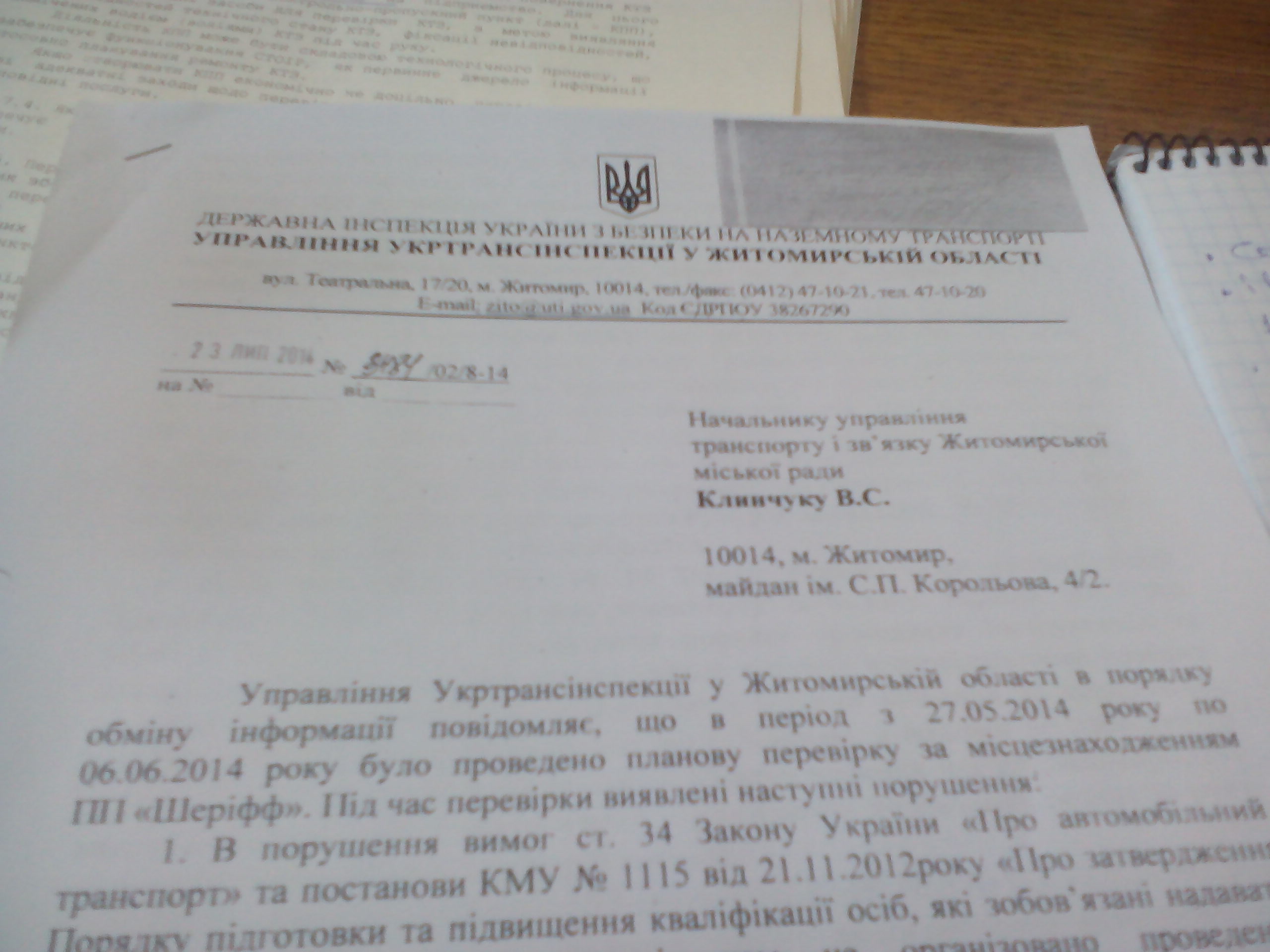 На розгляд конкурсному комітету (організатору) представником Управління Державної інспекції України з безпеки на наземному транспорті (Укртрансінспекції) у Житомирській області Осіповим Ю. А. було надано недостовірну інформацію. Першого дня було зачитано лист Укртрансінспекції про те, що перевізники-претенденти не мають порушень. Наступного дня з’явився лист про те, що ПП “Шеріфф” має порушень на 4 сторінки, про які Осіпов, як посадова особа контролюючого органу не повідомив. Хоча Осіпов водночас є членом конкурсного комітету.
