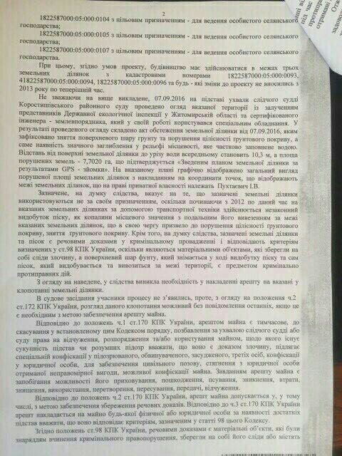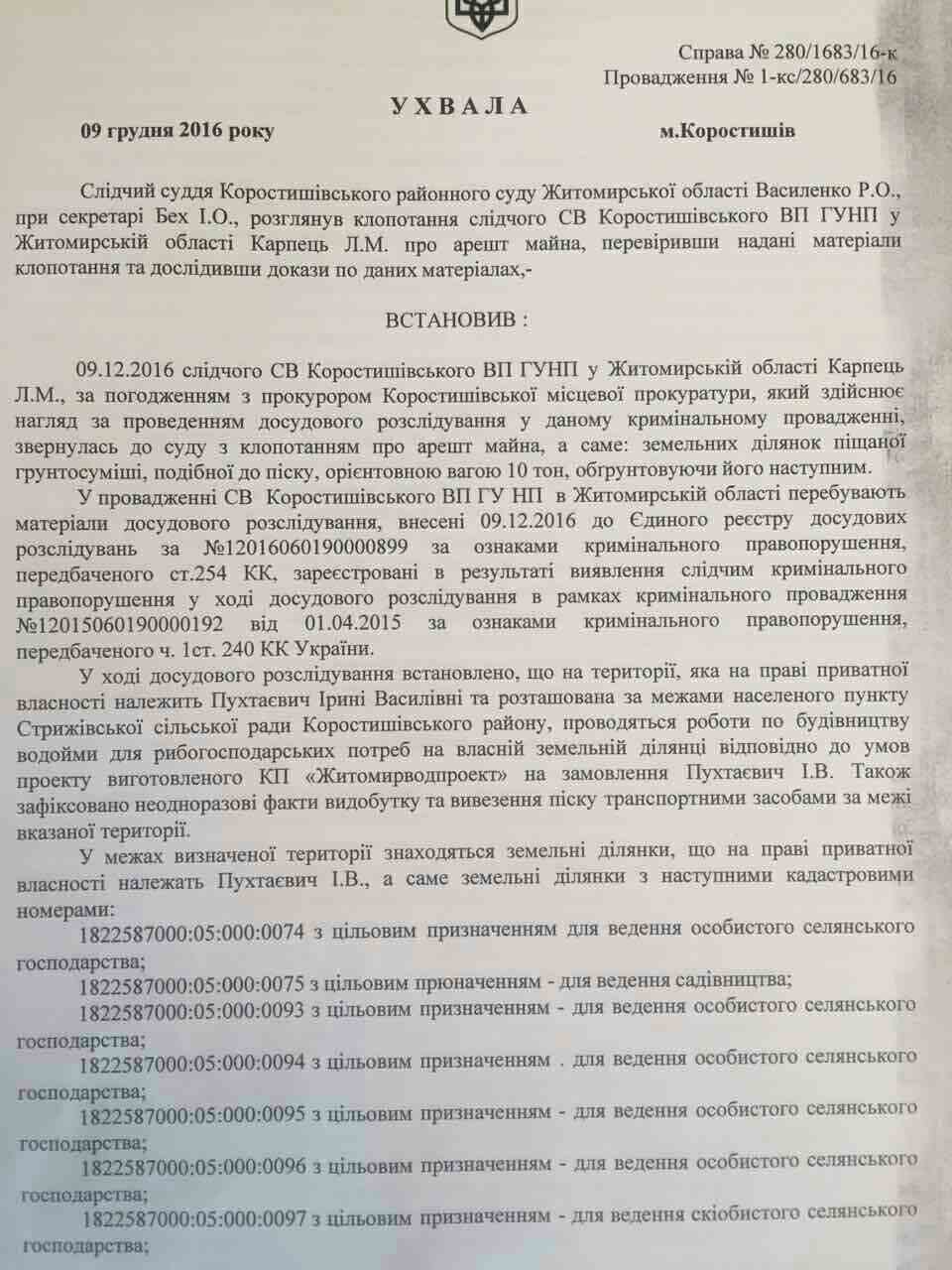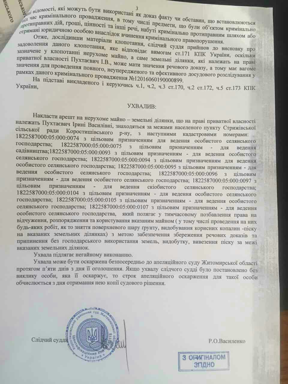 Тож повернемося до судового рішення. 9 грудня 2016 року Коростишівським районним судом було прийнято рішення накласти ареш на нерухоме майно – земельні ділянки, що на праві приватної власності належать Пухтаєвич Ірині Василівні, знаходяться за межами населеного пункту Стрижівської сільської ради Коростишівського району Житомирської області, який полягає у тимчасовому позбавлення права на відчуження, розпорядження та керування вказаним майном (у тому числі проведення на них БУДЬ-ЯКИХ РОБІТ (!!!), як то зняття поверхневого шару ґрунту, видобування корисних копалин – піску на вказаних земельних ділянках) з метою забезпечення збереження речових доказів та припинення без господарського використання земель, видобутку, вивезення піску за межі вказаних земельних ділянок. Детальніше ви, шановні читачі, можете ознайомитися з цим рішенням переглянувши нижче фотокопії цього документа. Але, нахабно ігноруючи рішення суду, роботи ведуться, пісок видобувається, вивозиться та продається. Все це робиться обережно, закамуфльовано (більш детально ми розкажемо у наступній публікації) з використанням сфабрикованої документації.