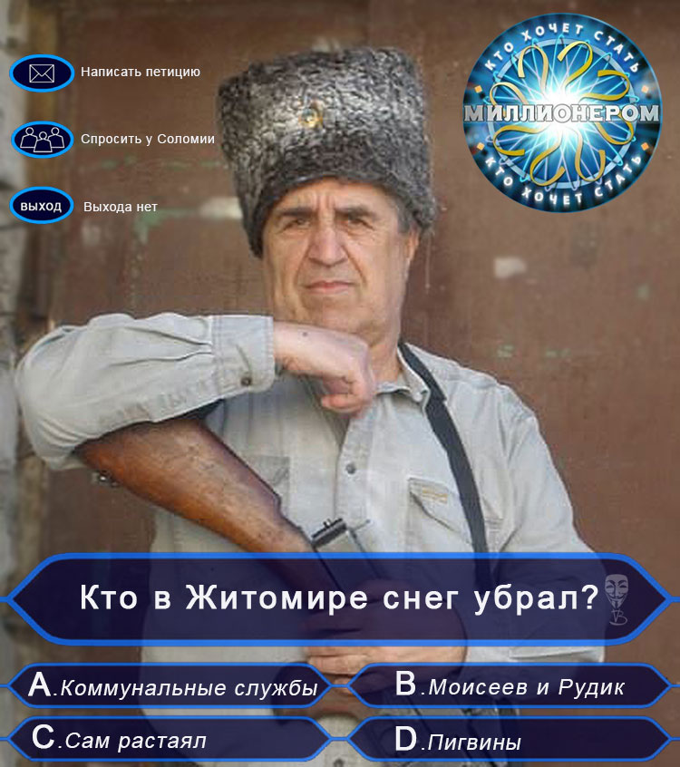Вон лютый февраль на дворе, а снега нет. Куда снег подевался? Не, кто не в курсе, тот может сказать, что снег толи растаял, толи его пингвины на полюс увезли. Но мы-то с вами имеем доступ к статьям на фейсбуке и на прочих эл. СМИ. И нас на мякине не проведешь. Мы четко знаем, что снега нет потому что его убрали Рудик и Моисеев!