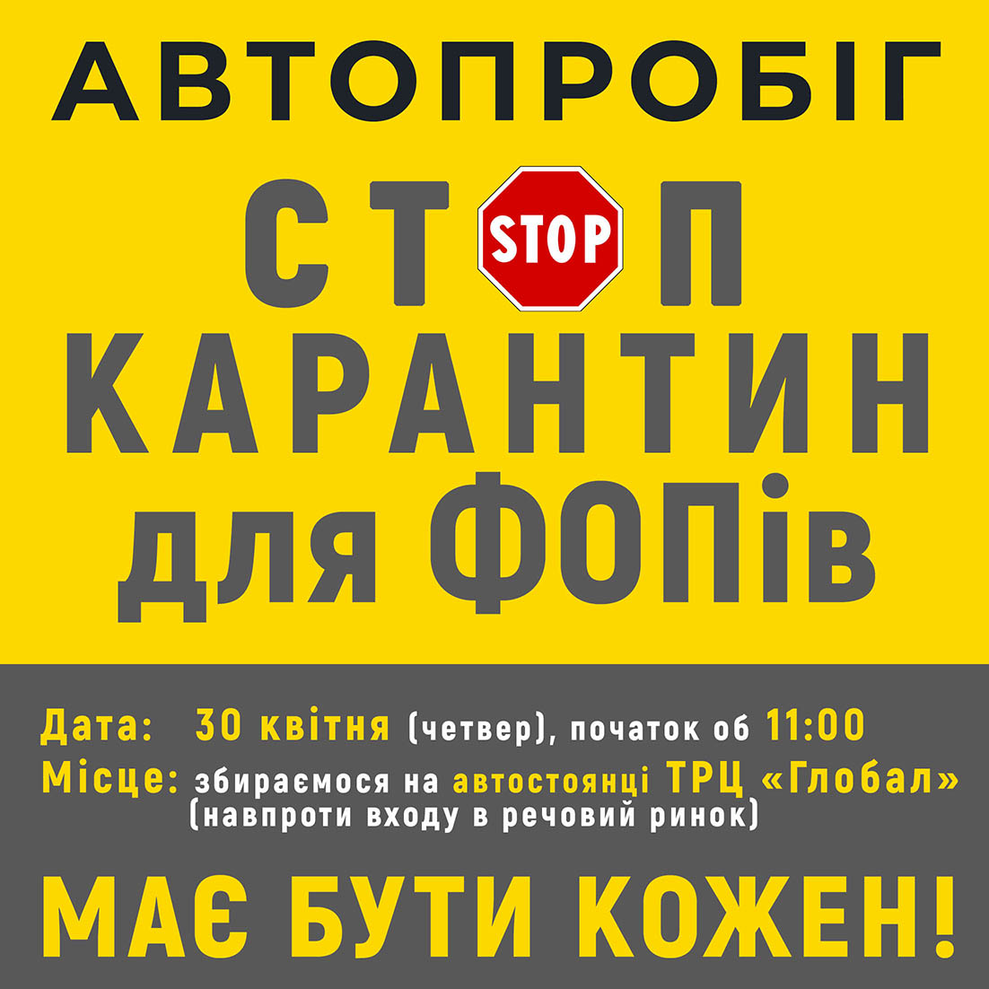 Тому прошу приєднатися до автопробігу! Ми маємо показати силу та створити майданчик для перемовин з головою адміністрації, міським головою, депутатами Верховної та місцевих рад. Нашою метою має бути не тільки припинення несправедливого карантину але майданчик, де ми маємо говорити про допомогу бізнесу, що постраждав в період карантину, про удосконалення оподаткування, про розумне та справедливе застосування касових апаратів, про розвиток підприємництва на Житомирщині, про те, що влада має радитись перед тим, як приймати рішення для нас без нас. В іншому випадку, ми ще довго будемо страждати від необдуманих рішень та несправедливого карантину.