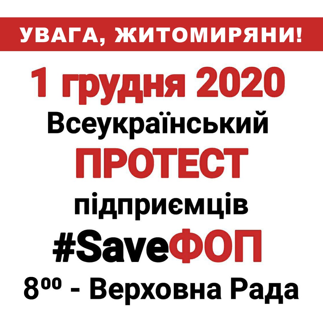 Тому, ми всі і не тільки підприємці маємо бути у вівторок 1 грудня 2020 року під стінами ВР та масовістю відстояти своє право на працю. Ми не раби! Ми українці! Це наша країна, а не олігархів, які хочуть знищити малий та середній бізнес та довести до злиднів мільйони українських родин як сьогодні вони майже довели до банкрутства казну країни!