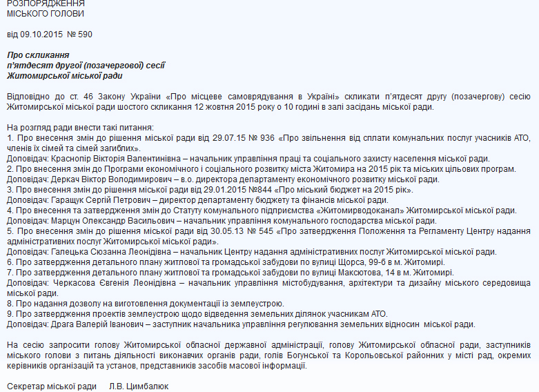 Именно на этой сессии секретарь горсовета публично заявила, что проекты решений можно обсуждать прямо на сессии, т.к. депутаты не приходят на комиссии. Клинч приобрел реальные очертания – депутатские комиссии не собираются, а пришедшие на сессию депутаты не хотят голосовать за вопросы, которые ранее не обсуждали или вообще получили проекты решений только перед сессией. Согласно Регламенту работы Житомирского горсовета, проекты решений рассматриваются перед сессией на депутатских комиссиях, которые поддерживают проект или вносят свои предложения. Предложения депутатских комиссий выносятся на голосование во время рассмотрения вопросов на сессии горсовета. Т.е. с одной стороны депутаты резонно возмущаются отсутствием рекомендаций комиссий, а с другой – сами же блокируют их работу.