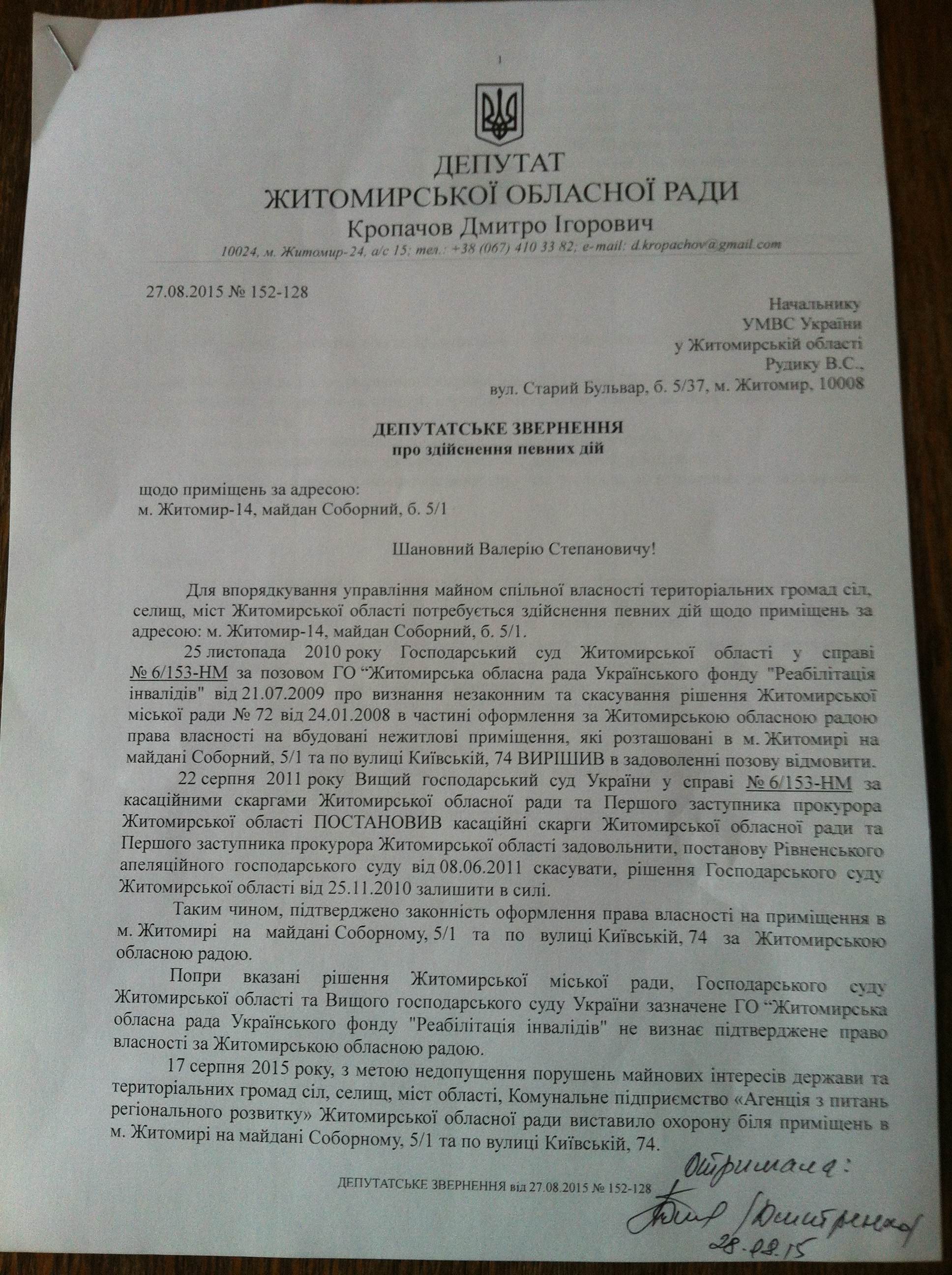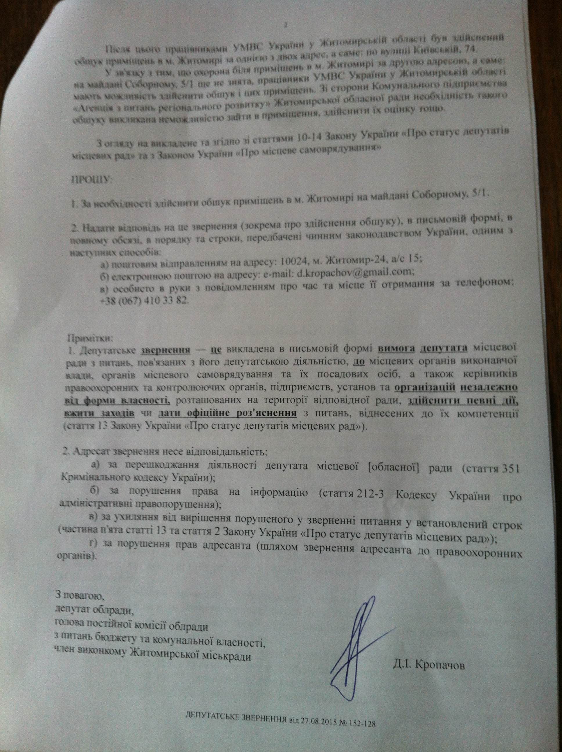 Публічне звернення депутата Житомирської обласної ради Дмитра Кропачова до начальника УМВС України у Житомирській області Валерія Рудика