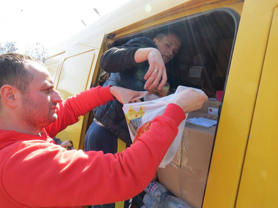 Ну а теперь о самой поездке. Она оказалось более сложной и более утомительной, чем предидущие. Дело в том, что мы выехали без одного сменного водителя, т.к. с нами поехал наш давний друг и помощник грузинский бандеровец, как мы его называем – Демна Кварцхелия. Этот человек с большим и добрым сердцем снаряжал и провожал нас в каждую нашу поездку, а в эту попросил взять его с собой. Отказать ему мы не имели морального права. Выехали 10.04.15 около 20:00. В Кочерове нас, как всегда, встретили Радомышляне и догрузили наши автобусы продуктами питания, пасхами, крашенками, тортами и множеством различных сладостей. Дальше была остановка в Киеве, где нам передали кевларовые шлемы и подарки для детей. Первая разгрузка была в Артемовске, куда мы приехали около 10 часов 11.04.15. Хочу заметить, что дороги от Чугуева до Артемовска практически нет. Есть направление и ямы. Такое ощущение, что Харьковские «керманичи» готовятся к встрече ху@ла. Ведь в России есть две беды – дураки и дороги. Ну, дураков и у нас достаточно, а дороги… В Харьковской области они уже почти соответствуют.