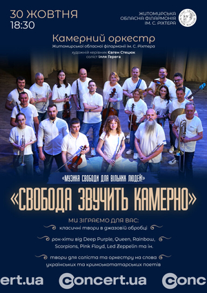 Житомирська обласна філармонія ім. С. Ріхтера запрошує 30 жовтня о 18:30 на концерт Камерного оркестру – «Свобода звучить камерно»!