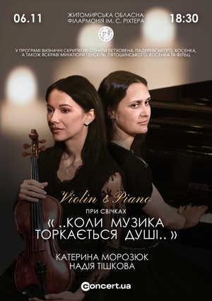 Запрошуємо на атмосферну подію при свічках, де музика торкається найтонших струн душі. У програмі вечора пролунають визначні скрипкові сонати таких майстрів, як Бетховен, Падеревський, Косенко, а також яскраві мініатюри Генселя, Лятошинського та Фільца. Це вечір для справжніх поціновувачів класики, де скрипка та фортепіано створюють неповторну гармонію і ніжність звучання.