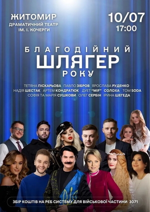 10 липня у Житомирському драматичному театрі відбудеться благодійний концерт «Шлягер року», метою якого є збір коштів на закупівлю РЕБ-системи для потреб військової частини 3071. Захід об'єднає провідних артистів української сцени задля підтримки Збройних сил України.