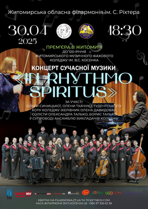 30 квітня 2025 року о 18.30, у рамках святкування 120-річчя Житомирського музичного фахового коледжу ім. В. Косенка у Житомирській обласній філармонії ім. С. Ріхтера відбудеться концерт сучасної музики In Rhythmo Spiritus, в якому через глибоку змістовність та пристрасні ритми поєднаються твори Мирослава Скорика та Мартіна Палмері.