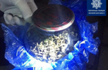 Близько опівночі на вулиці Київській у Житомирі патрульні поліцейські зупинили мопед, який порушив правила дорожнього руху. Водій-порушник виявився в розшуку Єнакієвським міськвідділом поліції за хуліганство, а пасажир почав втікати, аби приховати трилітрову банку з зеленою рослинною масою, схожою на наркотики.