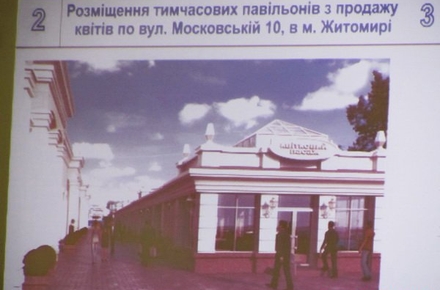 Начальник Инспекции по благоустройству, депутат горсовета от Партии регионов Юрий Самборский и представительницы ассоциации цветоводов Житомира представили проект «Цветочного пассажа» - павильона, который будет установлен вместо палаток на ул.Московской.
